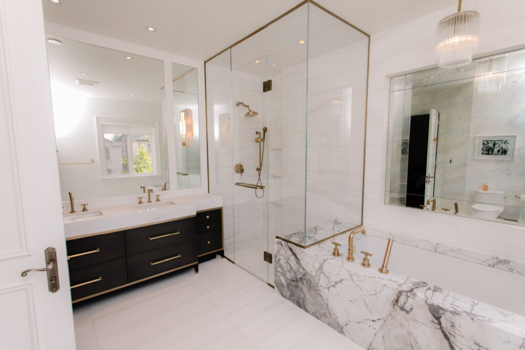 The polished Italian marble slabs that surround the tub will create a luxurious and elegant look that is sure to impress. The Rohl gold faucet added a touch of sophistication and complement the marble slabs beautifully. Adding a vintage mirror and mini chandelier crystal over the tub will create a focal point and added a touch of glamour to the space. Dual sink vanity, a thick quartz countertop provided longevity and practicality. The gold faucet and bathroom wall sconces will create a cohesive look with the Rohl faucet on the bathtub. A sitting area in the bathroom is a wonderful addition for creating a sense of relaxation and comfort